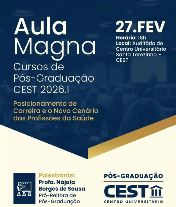 A Pós-Graduação do Centro Universitário Santa Terezinha – CEST realiza, no próximo dia 27 de fevereiro, às 18h, no Auditório do CEST, a Aula Magna CEST 2026.1, um momento estratégico de abertura do semestre letivo voltado à reflexão sobre carreira, mercado e futuro profissional.