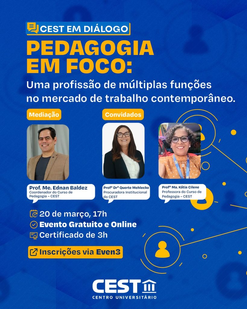 Com o objetivo de promover reflexões atuais e relevantes sobre essa área em constante evolução, o Centro Universitário Santa Terezinha (CEST) realiza o segundo episódio do projeto CEST em Diálogo, com o tema “Pedagogia em foco: uma profissão de múltiplas funções no mercado de trabalho contemporâneo”.