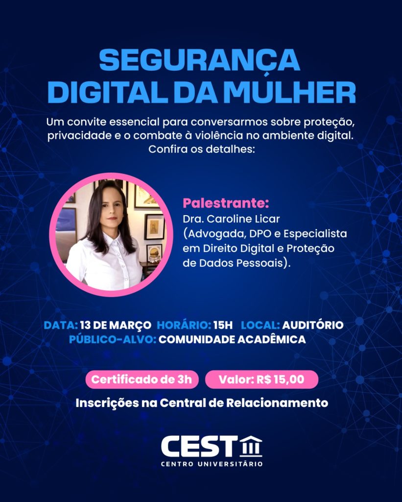 O Centro Universitário Santa Terezinha – CEST realizará, no dia 13 de março, a atividade “Segurança Digital da Mulher”, um momento de diálogo e conscientização voltado à proteção, privacidade e respeito no ambiente digital. A iniciativa busca promover reflexão e orientar a comunidade acadêmica sobre os desafios e riscos presentes no mundo online, especialmente no que diz respeito à segurança das mulheres.