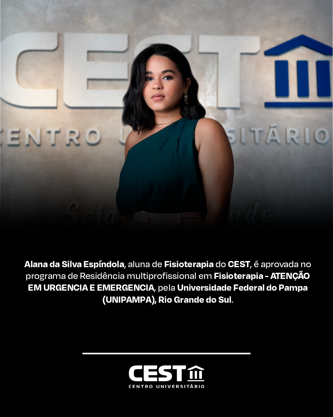 O Centro Universitário Santa Terezinha (CEST) celebra com grande orgulho a aprovação de Alana da Silva Espíndola, egressa do curso de Fisioterapia da instituição, no Programa de Residência Multiprofissional em Fisioterapia – Atenção em Urgência e Emergência, da Universidade Federal do Pampa (UNIPAMPA), no estado do Rio Grande do Sul.
