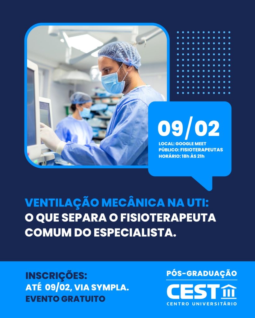 O Centro Universitário Santa Terezinha (CEST) promove, no dia 09 de fevereiro, o evento online “Ventilação Mecânica na UTI: o que separa o fisioterapeuta comum do especialista”, voltado exclusivamente para fisioterapeutas que desejam aprimorar sua atuação profissional e se destacar no mercado de trabalho.